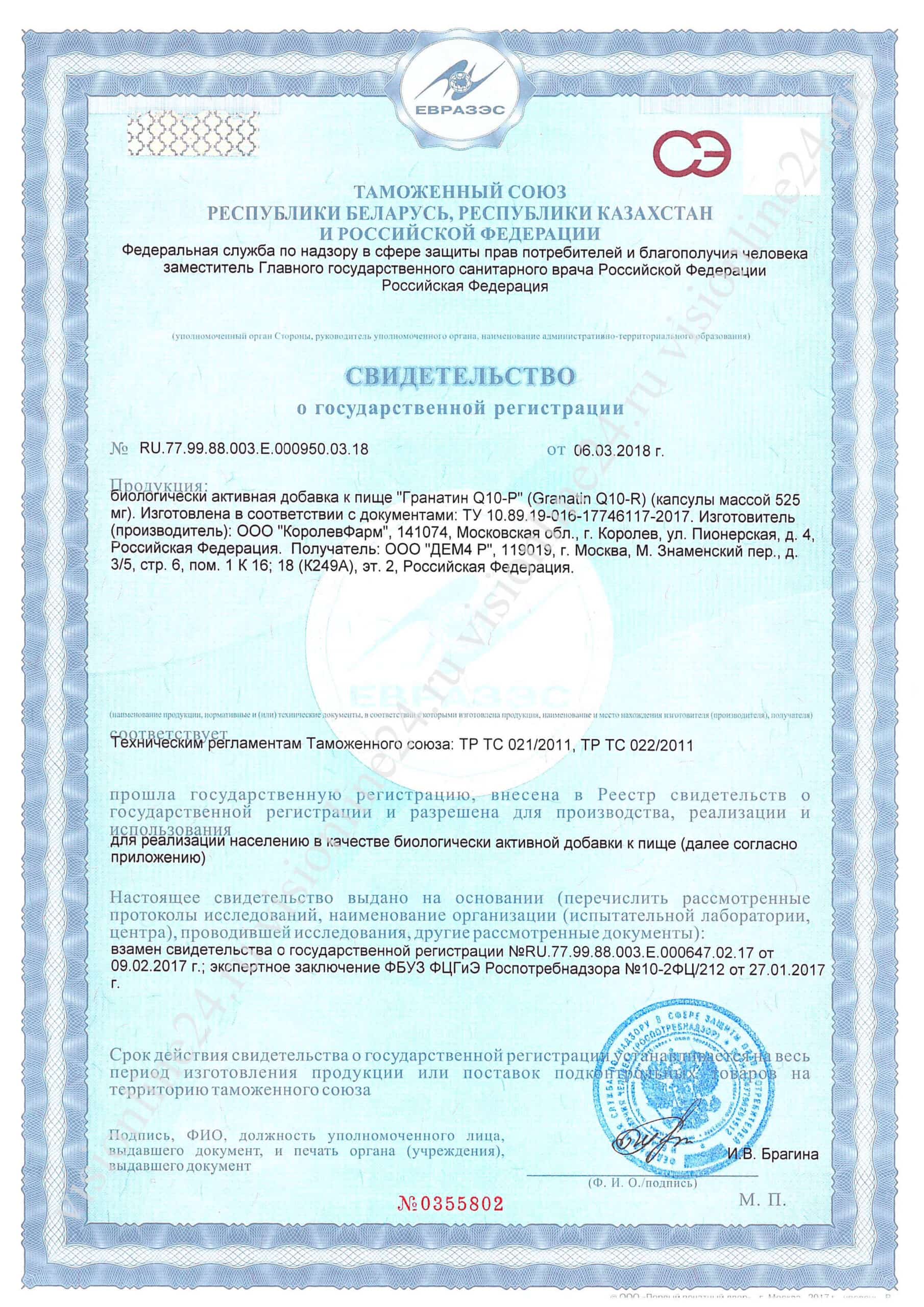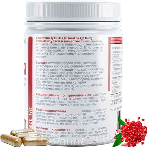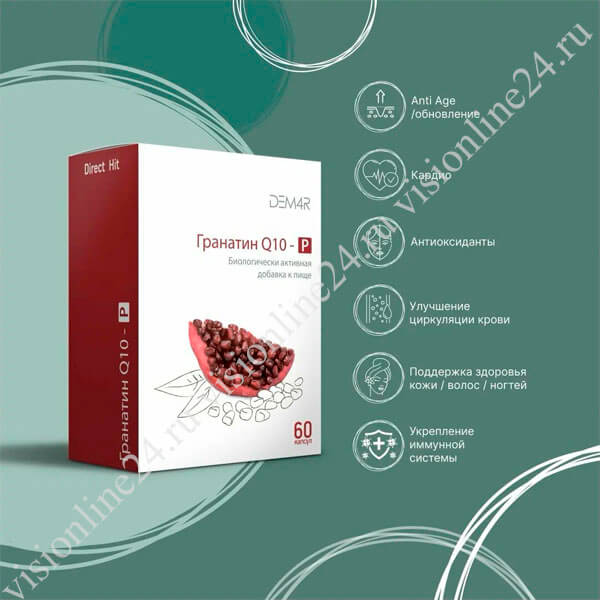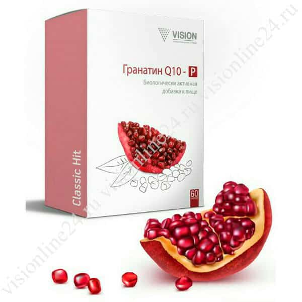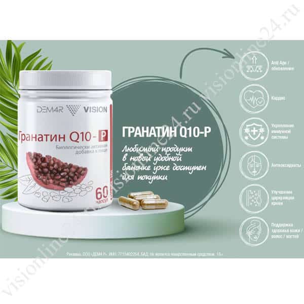 Гранатин Q10-Р Визион благотворно влияет на сердце и сосуды, может использоваться для профилактики различных заболеваний, а также в комплексном решении множества проблем. Помимо этого новый российский продукт обеспечит наш организм дополнительным источником важной энергии, затормозит старение, усилит иммунитет, на длительный период сохранит прекрасный внешний вид, за счет эффективной борьбы с морщинами.
