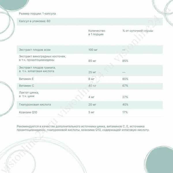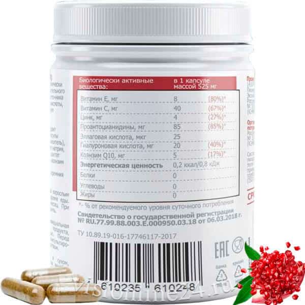 Эффективность нового комплекса обеспечена важными составляющими, такими как гранат, коэнзим Q10, экстракт асаи и виноградной выжимки, а также многие другие ингредиенты. Улучшенная формула этого продукта Визион обеспечивает каждого человека дополнительной жизненной силой и энергией за счет превосходных антиоксидантных действий препарата.