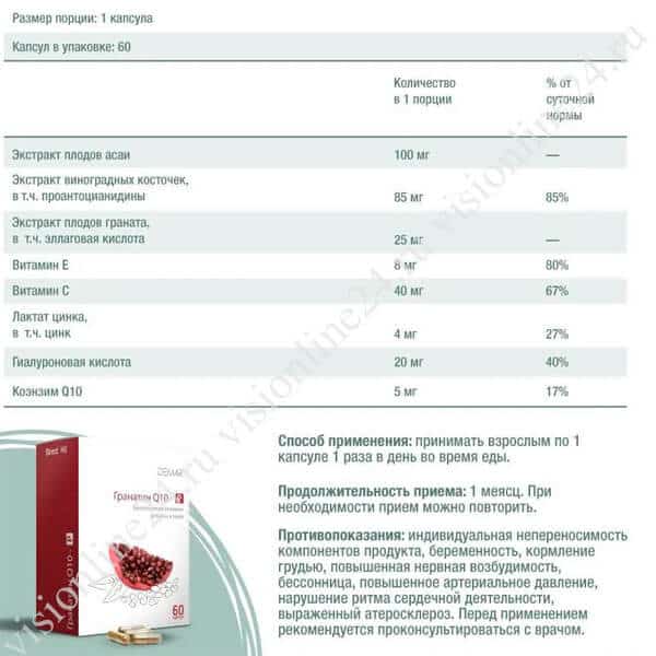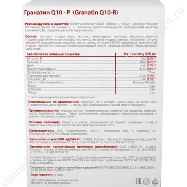 | Гранатин Q10 Vision (Франция, Аркофарма) | Гранатин Q10-Р Визион (Россия, ДЕМ4Р) |